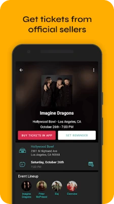Z Bandsintown odkryj świat muzyki na żywo! Ta nagradzana aplikacja pomoże Ci znaleźć koncerty i festiwale ulubionych artystów w Twojej okolicy. Bądź na bieżąco z występami, kupuj bilety i nigdy nie przegap żadnego wydarzenia muzycznego. Bandsintown to Twój przewodnik po scenie live.