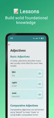 Zanurz się w bogactwie tematycznych kategorii, które obejmują niezbędne słownictwo, powszechnie używane zwroty, praktyczne wskazówki gramatyczne oraz wyrażenia kluczowe w codziennej komunikacji. DarijApp prowadzi Cię przez proces nauki, umożliwiając systematyczne budowanie solidnych podstaw i pewności w posługiwaniu się Dariją. To kompleksowe narzędzie aktywnie wspierające Twój językowy postęp.