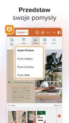 MobiOffice to kompleksowe rozwiązanie biurowe, które zmienia sposób, w jaki pracujesz z dokumentami tekstowymi, arkuszami kalkulacyjnymi i prezentacjami. Dzięki szerokiej gamie zaawansowanych narzędzi, takich jak malarz formatów, śledzenie zmian, formatowanie warunkowe czy tryby prezentacji, zyskujesz pełną kontrolę nad swoimi projektami. Znajomy interfejs sprawia, że nawigacja jest intuicyjna i przyjemna, a rozbudowane opcje zabezpieczeń chronią Twoje dane. Z łatwością eksportuj swoje pliki Word, Excel czy PowerPoint do uniwersalnego formatu PDF, zachowując ich oryginalny wygląd.